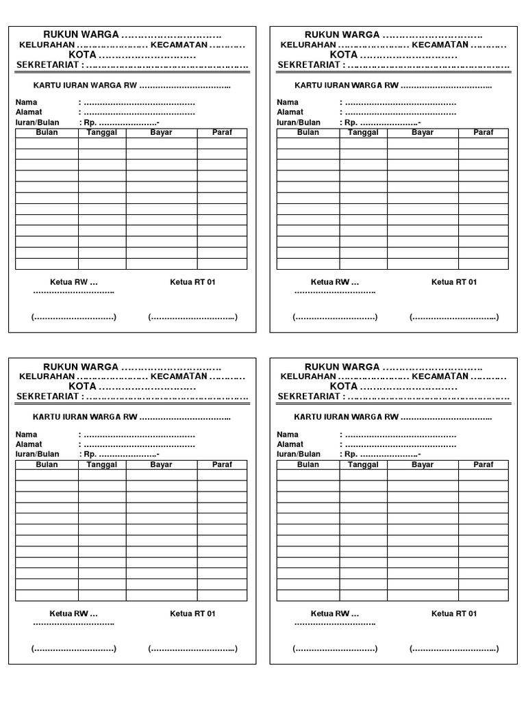 Contoh Kartu Iuran Warga Rw 01