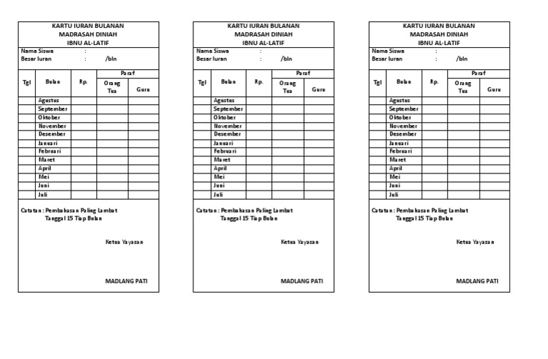 Contoh kartu infaq madin Madrasah Diniyah Takmiliyah Awaliyah Wustha Ulya MDTA DTA dll. We make completing any Format Iuran Bulanan more convenient. Download Contoh Kartu Spp Les PDF 2000 MB - SamPDF SamPDF Cara membuat kartu SPP Syariyah Iuran Bulanan PANDUAN MICROSOFTWORD ARIECELLULAR Assalamualaikum selamat sore Mari kita belajar lagi di sini saya.