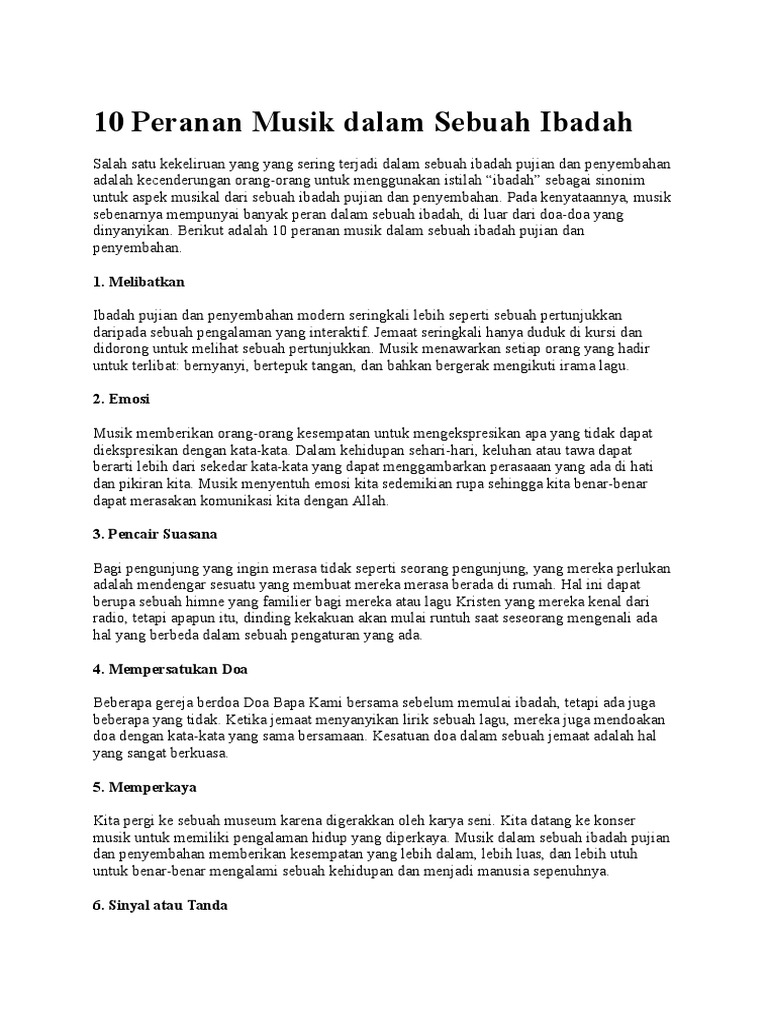 1 Penyembahan yang alkitabiah dalam jemaat tidak menekankan pada penggunaan musikDua kali penyebutan musik dalam surat-surat di Perjanjian Baru berfokus pada pembangunan edifying orang-orang kusud saat dinyanyikan kepada Tuhan Ef. Orang yang rajin beribadah akan selalu mendapatkan hatinya hidup dalam kedamaian serta mendapatkan hatinya hidup dengan penuh kekuatan 20.