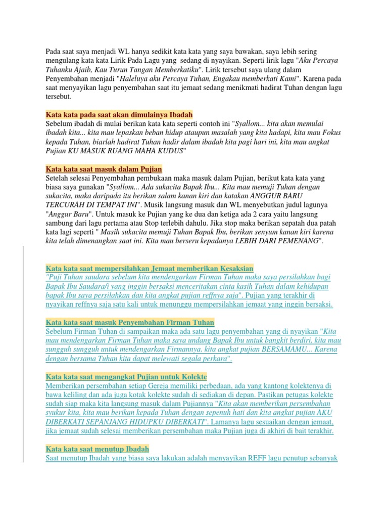 Sesungguhnya penyembahan alkitabiah menekankan bahwa Allah disembah melalui segala sesuatu yang dilakukan dalam. Kumpulan kata kata Penyembahan WL Pemimpin Pujian Seorang Pemimpin Pujian dalam sebuah ibadah Kristen tentu harus bisa menguasai panggung. Seorang pemimpin ibadah yang baik harus mampu memimpin ibadah sesuai dengan aturan ibadah.
